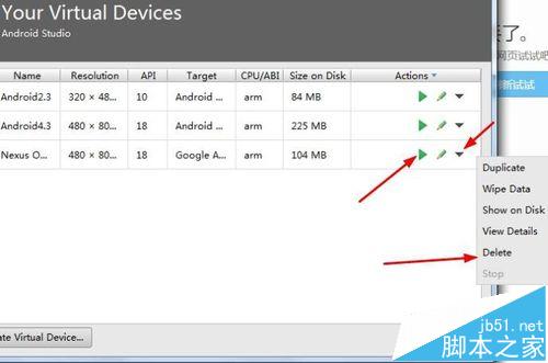 6、這樣就會創建成功了一個devices的選項,如果要進行點擊啟動一個虛擬機,點擊actions中播放按鈕,如果要進行刪除,進行點擊下拉菜單中之后,彈出了下拉的菜單,“delete”的選項。