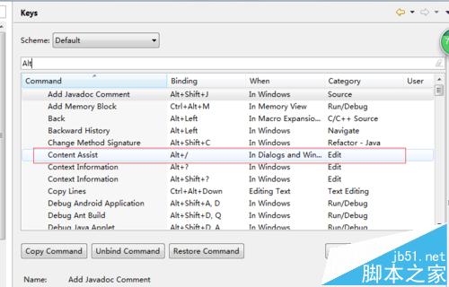 5、進入到了keys的窗口的界面中之后,找到一項為content assits的選項,并選中這個。