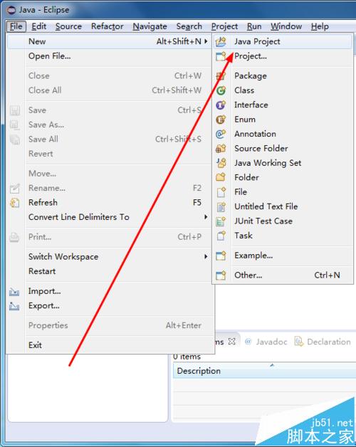 單擊快捷菜單new圖標——彈出快捷菜單選擇java project 。