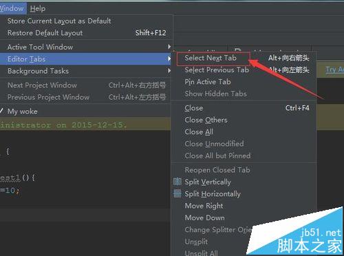 5、進(jìn)行點(diǎn)擊完editor tabs的選項(xiàng)之后,就移動到下一級菜單中的“select next tab”的選項(xiàng),就會標(biāo)簽的窗口向前移動。