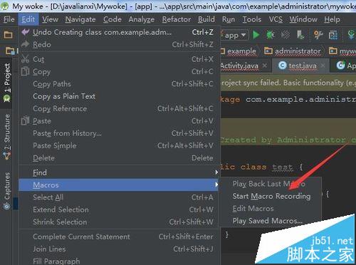 1、進行打開Android studio的工具后,進行點擊Android studio菜單中的edit后,就會彈出了一個下拉的菜單中進行選擇macros的選項。