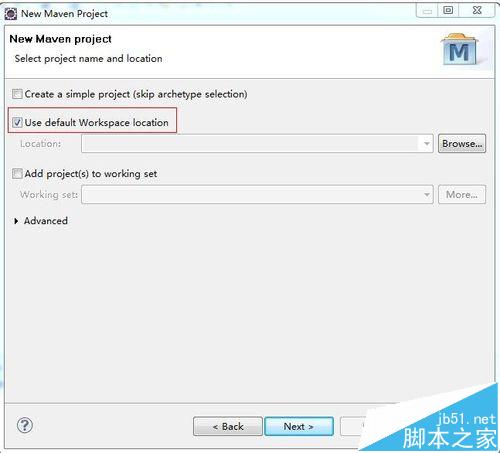 3、根據項目的實際情況選擇項目的存放目錄,也可以選擇【Use default Workspace location】默認工作空間。如下圖所示: