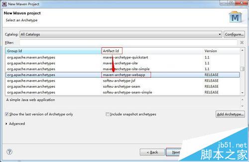 4、在Artifact Id中選擇maven-archetype-webapp,如下圖所示: