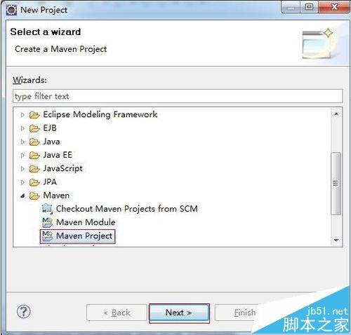 2、在New窗口中選擇 Maven -> Maven Project。點擊【next】如下圖所示: