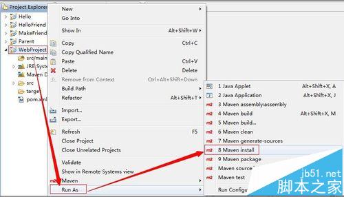 2、將web項目發布到tomca服務器的webapps目錄。選中Web項目(或者選中Web項目的pom.xml文件)→【Run As】→【Maven install】,如下圖所示: