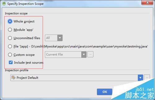 4、然后就會彈出了一個speoify inspection scope的談出框,在inspection scope中,whole project為是整個的項目檢查,如果只想檢查剛才選中的文件,進行選中第四個選項即可file【app】即可,然后進行點擊OK。