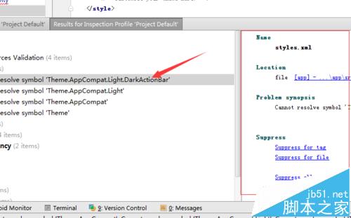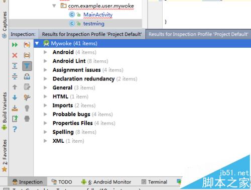5、那么在就會Android studio的底部位置中,彈出了一個項目的檢查的結果,也是檢查結果的列表。