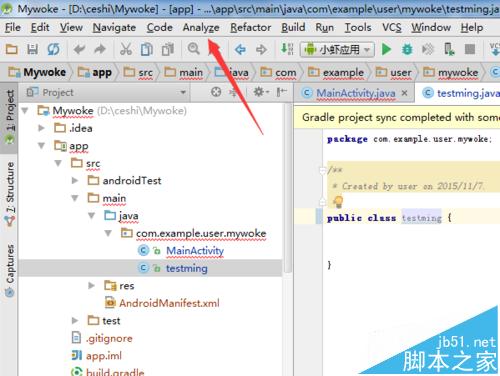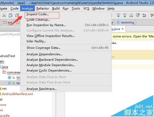 2、項目的文件被選中完成之后,進行點擊Android studio菜單中的Analyze選項菜單。
