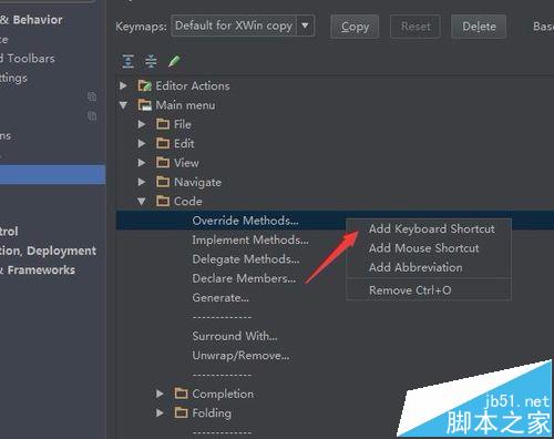 5、進入到了code的選項中之后,在code的列表中找到需要進行更改快捷鍵的菜單,進行右鍵該快捷鍵,彈出了進行選擇add keyboard shorttcut的選項。