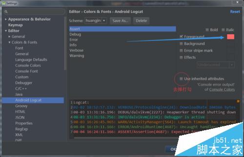 2、把復選框的勾去掉之后我們就可以點擊右邊的前景或背景顏色選框進行設置我們想要的顏色了,設置要和左邊的 Assert、Debug、Error、Info、Verbose、Warning一 一對應起來