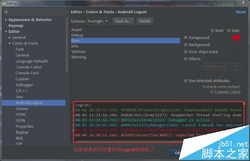 1、打開 android studio2.0 選擇 File--> Editor --> Colors & Fonts --> Android Logcat 就可以看到如左圖的 要把復選框的勾去掉再進行設置顏色