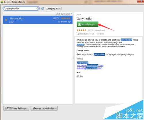 3、在搜索欄里輸入genymotion關鍵字,可以看到右側已經搜索到插件,點擊install安裝。