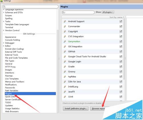 2、在打開的settings界面里找到plugins設置項,點擊右側的“Browser。。”按鈕
