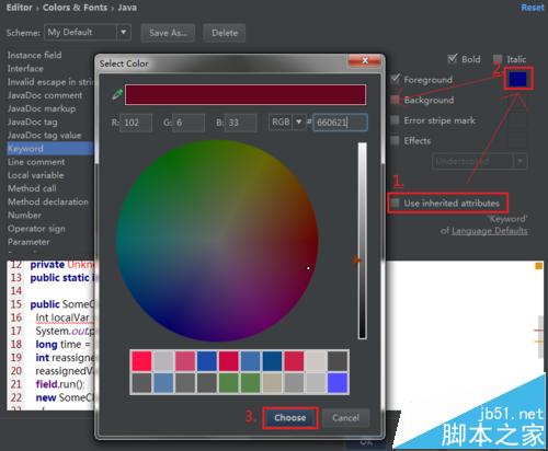 7、在修改顏色前,首先確保不勾選“Use inherited atrributes”,再點擊顏色框,最后在彈出的顏色選擇對話框中選擇自己期望的顏色,點擊choose選擇。