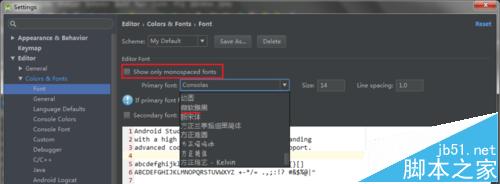 1、首先在菜單欄找到File菜單,然后File>Settings>Editor>Colors & Fonts>Font,準備修改字體。不幸的是,Android Studio自帶的Scheme是不允許修改字體的,如下圖所示。