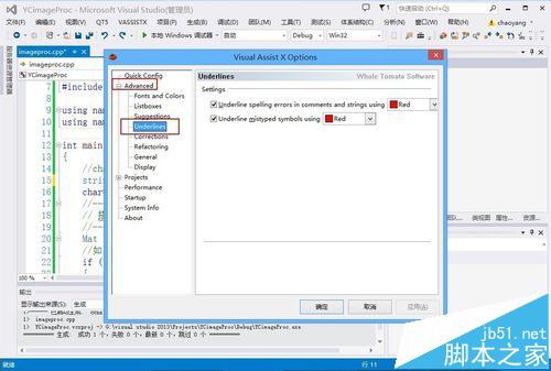3、執行第2步操作后會打開VS助手的選項設置頁面,在這個頁面里我們可以對VS助手做出相應調整,更改它的語法檢查項等等,在下圖中找到“Advanced”——”Underlines“,如下圖所示