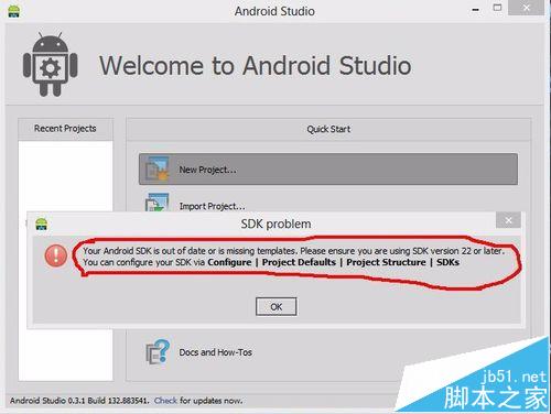 2、在Android Studio中新建項目時有時會遇到“Your android sdk is out of date or is missing templates”的問題,這個問題是你使用了軟件默認的sdk安裝路徑所導致的。