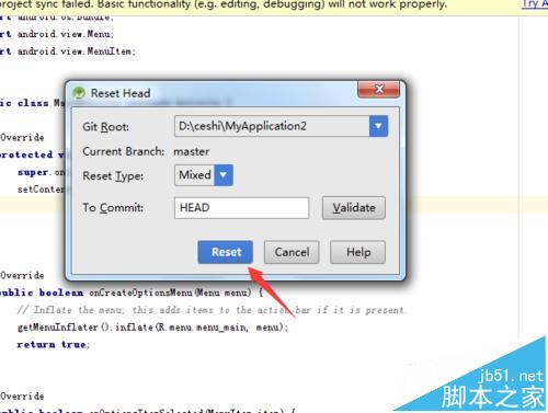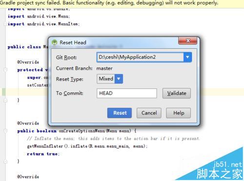4、彈出了一個reset Head的選項中,要把項目到電腦中路徑的,在git root的進行選擇路徑。對需要進行回退的版本信息進行確認,可以進行點擊“Validate”的選項。
