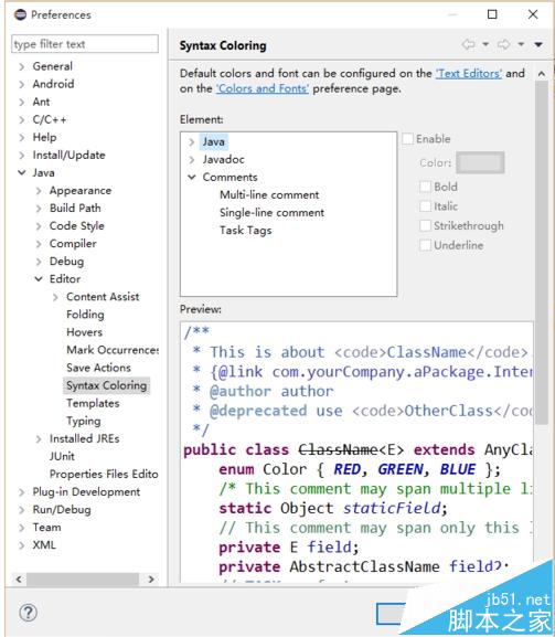2、修改注釋顏色:window -- preferences -- java --editor --syntax coloring -- comments 中的前兩個就是修改注釋顏色的。點擊右邊的color修改顏色就行了。右側(cè)還有Italy,Bold等字體樣式,自己也可以選擇。
