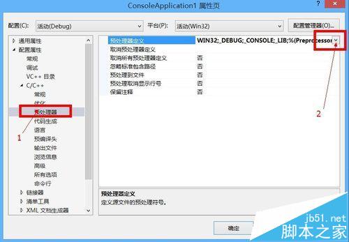 2、然后彈出文件的屬性頁,單擊1“預處理器”,再單擊2打開預處理器如下圖