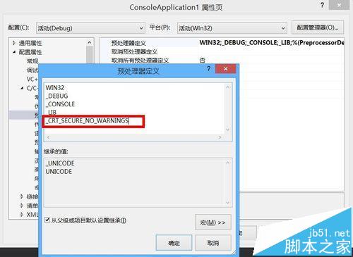 3、將“_CRT_SECURE_NO_WARNINGS”復制在以下紅色框內,然后確定再單擊應用即可。