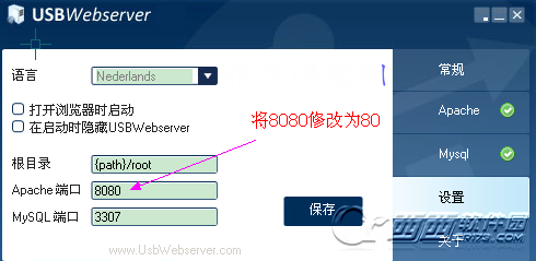 3、由于該工具包默認(rèn)開啟的網(wǎng)站端口為 8080 ,所以我們需要進(jìn)入“設(shè)置”,將Apache端口手動(dòng)修改為 80 ,點(diǎn)擊保存后如果沒有生效,請(qǐng)關(guān)閉軟件重新打開即可解決~