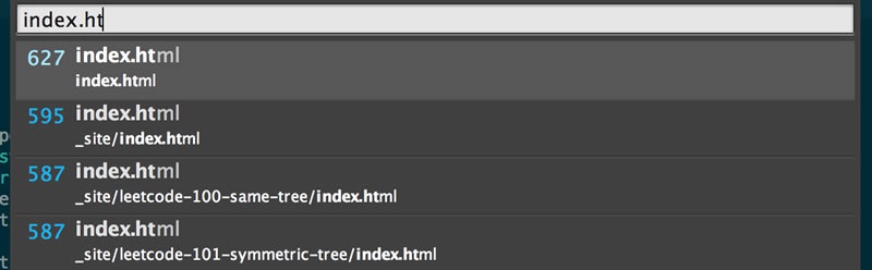 如果你之前用過Coda、Textmate或者Dreamweaver你可能對側邊欄上的文件導航及其依賴。Sublime Text帶來了Goto Anything特性,只需要按下簡單的 ⌘ (Ctrl on Windows) + P 就可以前往任何你想到達的位置,這是你能想到的打開文件的最快的方法。智能感知的提示框提供了模糊匹配,我們不需要記住準確的文件名,也不需要記住他在哪層文件夾里。