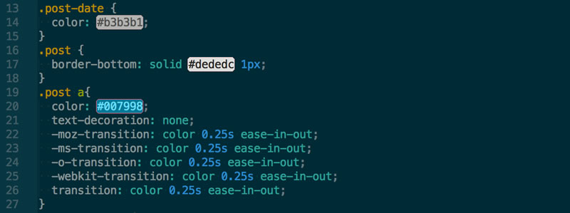 這個插件我等了很久了,我最早用Sublime Text寫CSS時候就在想“這堆顏色碼誰知道是什么顏色”… Color Highlighter這個插件會檢測CSS文件中的顏色碼,不論是Hex碼或者RGB碼都能很好的顯示。Color Highlighter能夠設置成用背景色或者邊框提示顏色,我一般在Settings里做這樣的設置: