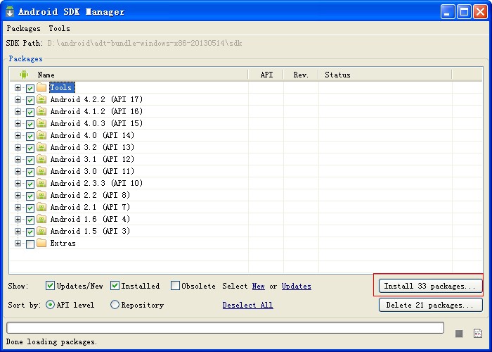 打開解壓出來的文件夾里面的 SDK Manager.exe (也可以運行eclipse/eclipse.exe 然后通過Windows -> Android SDK Manager打開)
