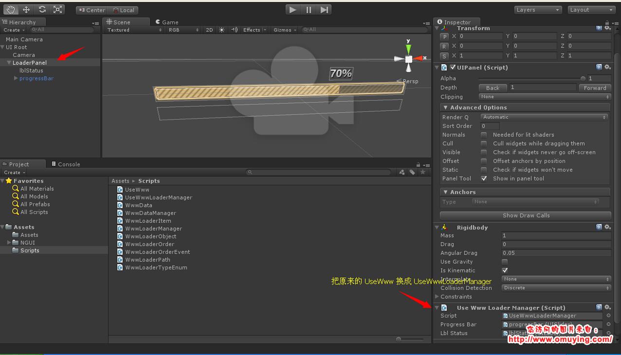 因為前面我封裝了一個 WWW 加載管理器(查看詳情),我們可以直接拿來使用,我們建立一個新的 C# 腳本,取名 UseWwwLoaderManager.cs,全部代碼如下: