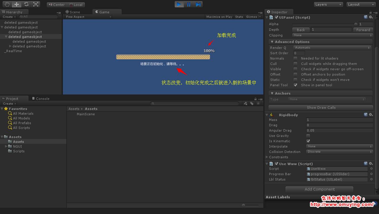 // 加載場景使用 WWW.LoadFromCacheOrDownload,函數(shù),這樣加載完成才能使用 Application.LoadLevel 或者 Application.LoadLevelAsync