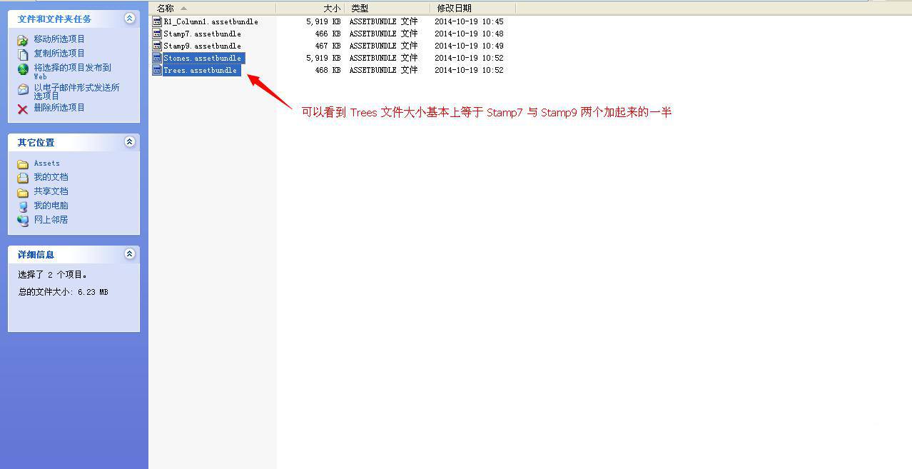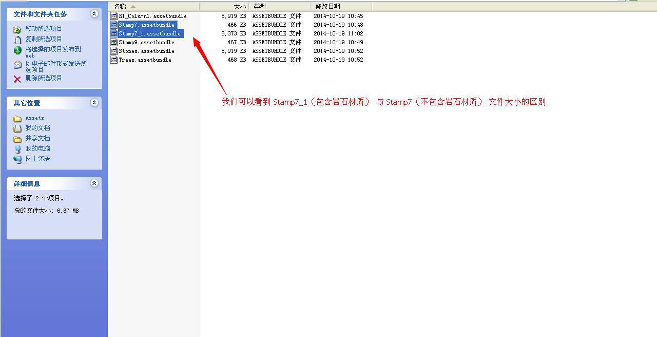 從圖中我們可以看出 Trees(包括 Stamp7 與 Stamp9 兩個預(yù)設(shè)文件)的大小差不多是 Stamp7 與 Stamp9 大小的一半,這是因為 Stamp7 與 Stamp9 材質(zhì)相同,在打包的時候,共享一份材質(zhì),所以材質(zhì)只有一份。