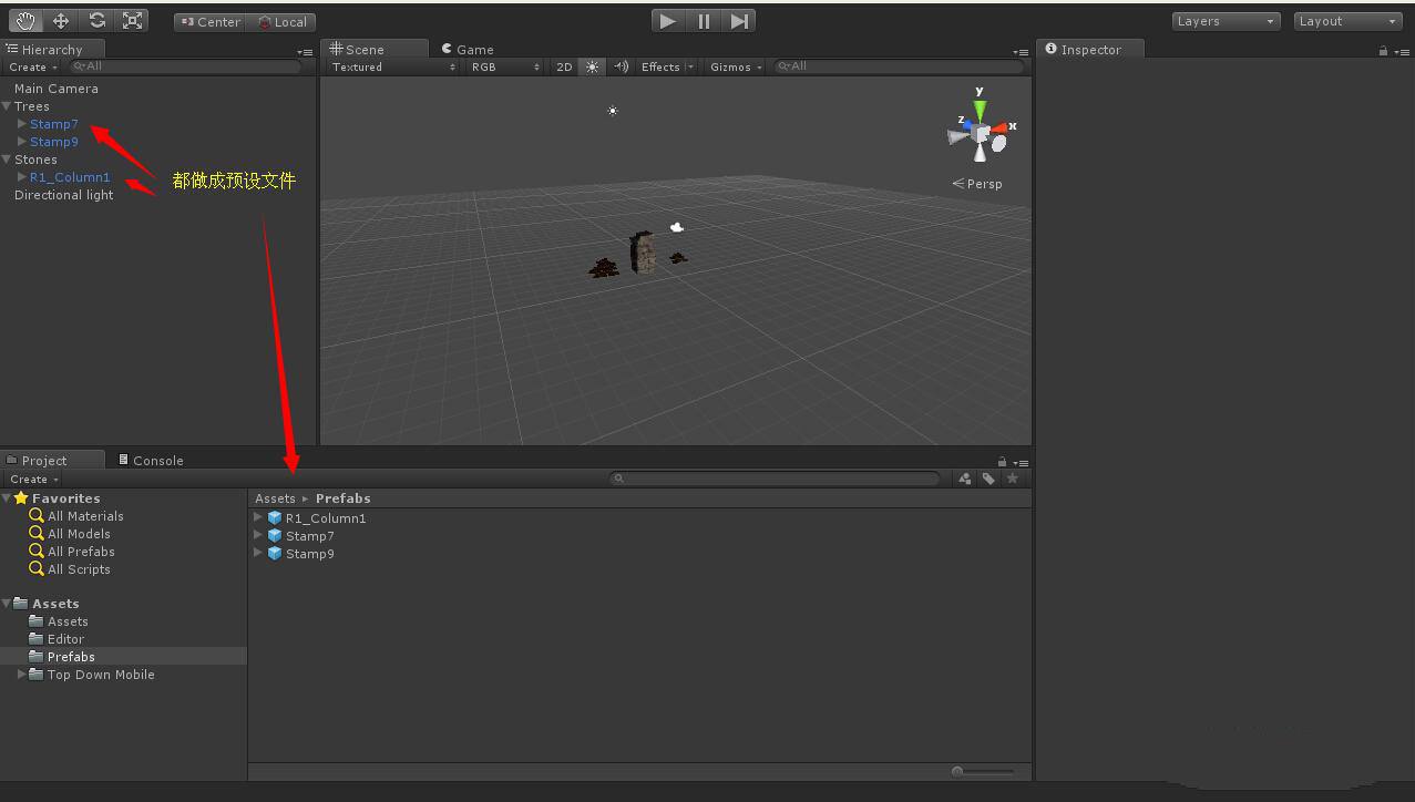 接著我們把場景的子對象(場景中的 Stamp7、Stamp9、R1_Column1)先做成預(yù)設(shè),如圖: