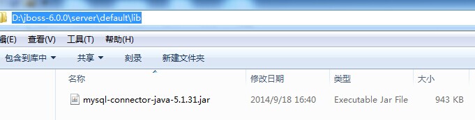 1. 將mysql-connector-java-5.1.31.jar拷貝到 D:/jboss-6.0.0/server/default/lib 如下: