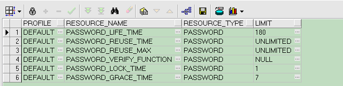 select * from dba_profiles where profile='DEFAULT' and RESOURCE_NAME like 'PASSWORD%';