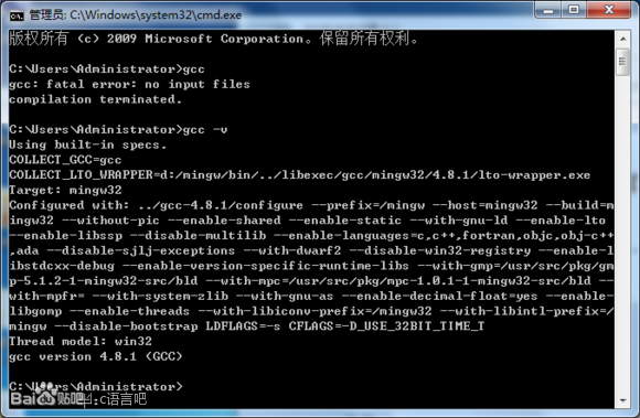 最后在CMD中輸入gcc -v,看看有沒有安裝成功,如果出現一下畫面說明安裝成功
