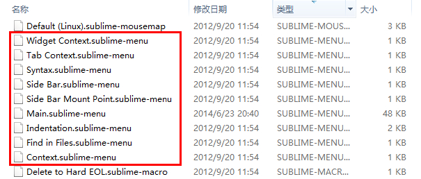 按類型排序,然后找到 .sublime-menu 和 .sublime-commands 結尾的文件。