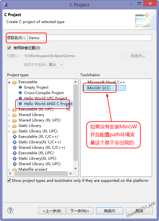 新建一個“Hello World ANSI C Project”,右邊注意選擇“MinGW GCC”,否則又會有各種問題出現。如果沒有安裝MinGW并且配置path環境變量這個是不會出現的。