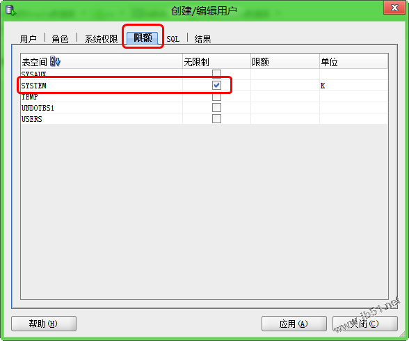 注意2:同時還要在“限額”選項卡里面勾上system表空間,否則創建表的時候會提示沒有權限在system中創建表。