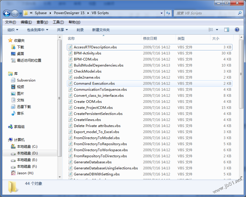 在“D:/Program Files (x86)/Sybase/PowerDesigner 15/VB Scripts”中可以看到系統內置的vbs文件格式的腳本。