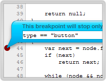 調試的另一個方法是設置斷點。Script標簽允許你在任意行暫停執行。單擊行號,就會設置一個斷點。右擊行號,就可以設置一個斷點出現的條件,只有當條件為真時,程序才會暫停執行。右面還有一個watch窗口,可以查看當前變量的值。