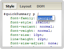 Firebug允許你編輯CSS的屬性和屬性值。你只要對它們點擊,就能編輯。修改后的效果會立刻在瀏覽器窗口中顯示出來。這個特性最好的運用,是在確定準確定位的padding和margin時,firebug允許你用方向鍵逐單位的增加。