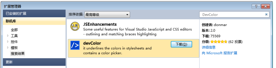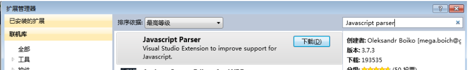 由于最近寫的JavaScript稍微多了一點,然后在查看的時候就很不方便,總是要拖動滾動條來查找。于是就想著這JavaScript代碼能否像在C#代碼一樣可折疊呢?這款工具可直接通過VS的擴展管理器中進行下載,如下所示:
