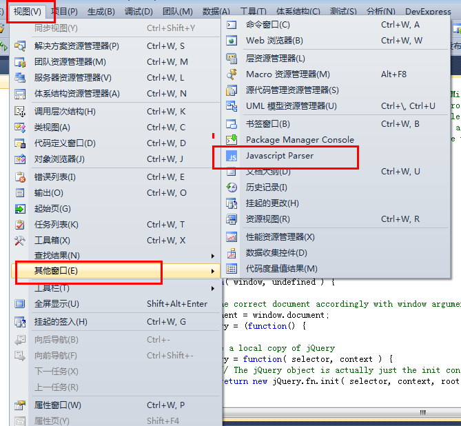 同樣下載安裝重啟VS,來查看效果。重啟VS之后首先在菜單中視圖===其他窗口===JavaScript Parse。