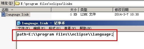下載完解壓縮后,會有個包含features和plugin目錄的eclipse文件夾,把這個eclipse放在我們的Eclipse安裝根目錄,也就是和eclipse.exe同一級目錄下。然后仍然在這一級目錄下,新建一個links文件夾,并在該文件夾內,建一個language.link的文本文件。該文本文件的名字是可以任取的,后綴名是.link,而不是.txt喲。好了,最后一步,編輯該文件,在里面寫入剛才放入的語言包的地址,并用“//”表示路徑,一定要有path= 這個前綴。