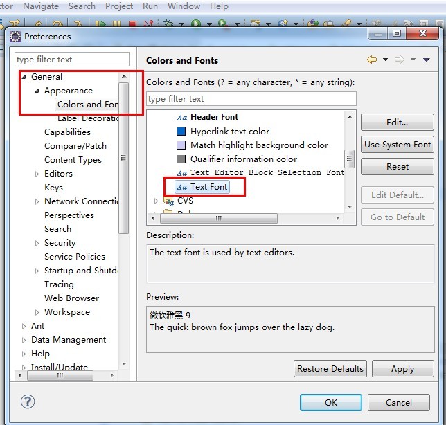 設置代碼的字體類型和大小:Window -> Preferences -> General -> Appearance -> Content Assist -> Colors and Fornts,只需修改 Basic 里面的 Text Font 就可以了
