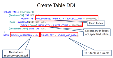 內存數據庫的創建過程其實就是將表存放到內存中,而不是整個數據庫。下圖展示 了創建內存優化表的語法,紅色框標注了內存與傳統表創建時語法不相同的地方。