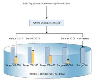 如上圖,該內存數據庫有5個data file,分別存放了事務范圍在100-200、200-300、300-400、400-500及500的數據。如果有一個時間戳為501的事務需要刪除時間戳為150、250、450的事務所產生的數據和增加一些新數據時,相應的IO請求就會被分配到第1、2、4的 delta file上和第5的data file上。刪除操作可以分配到多個文件上,并且同時進行,這樣就可以加快刪除的效率。