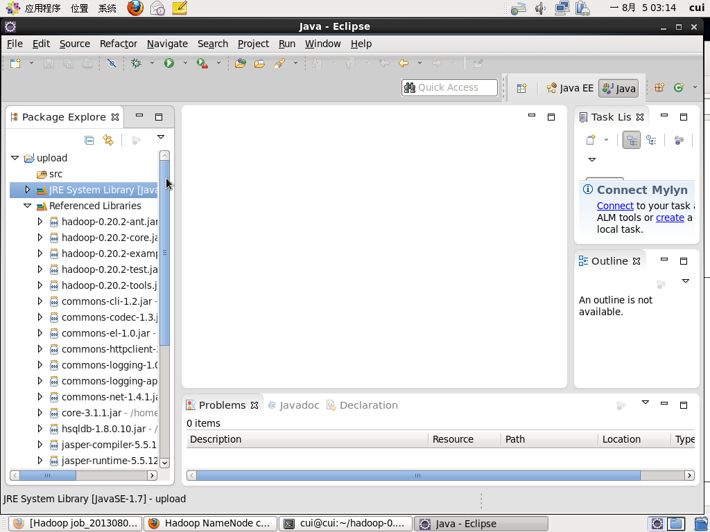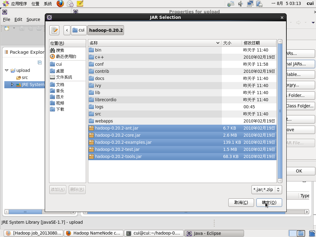 通過Add External JARS --〉Hadoop-0.20.2下所有的jar包以及lib下所有的jar包。OK。操作步驟如圖: