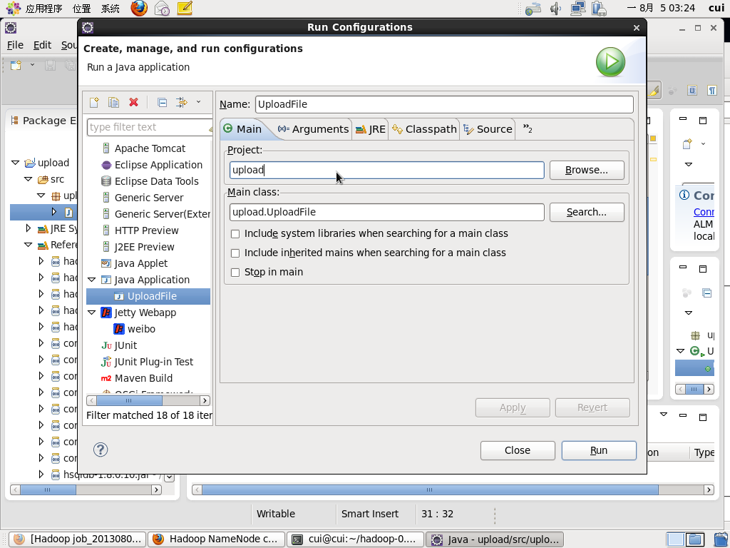 Arguments 加兩個參數/home/cui/xxxx hdf://cui:9000/xxx Applay Run